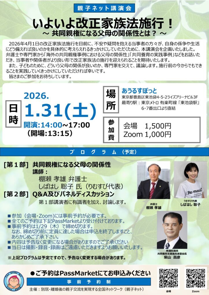 【2026.01.31】 親子ネット講演会いよいよ改正家族法施行!~共同親権になる父母の関係性とは?~ new!
